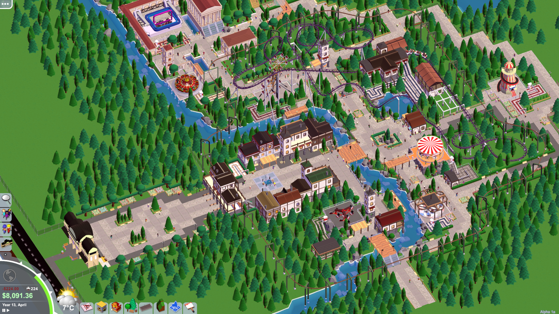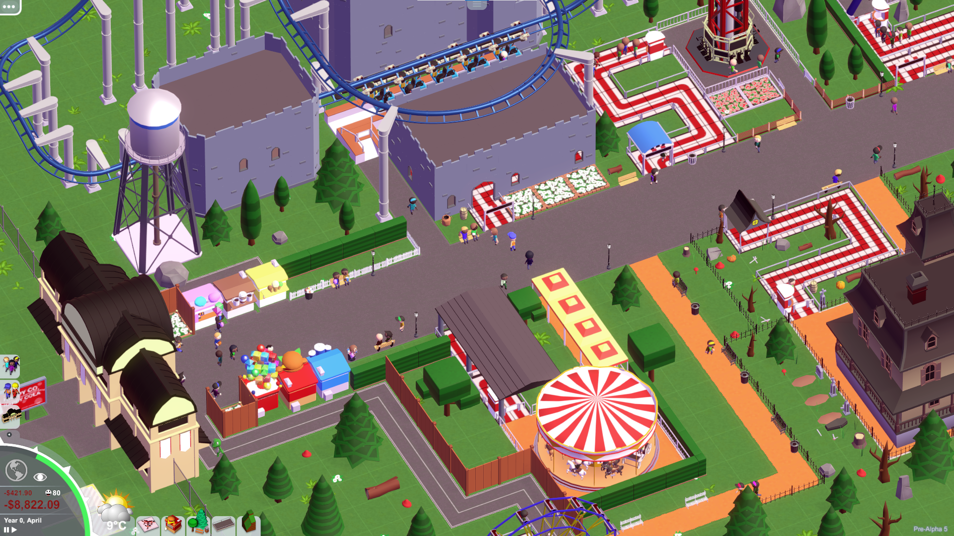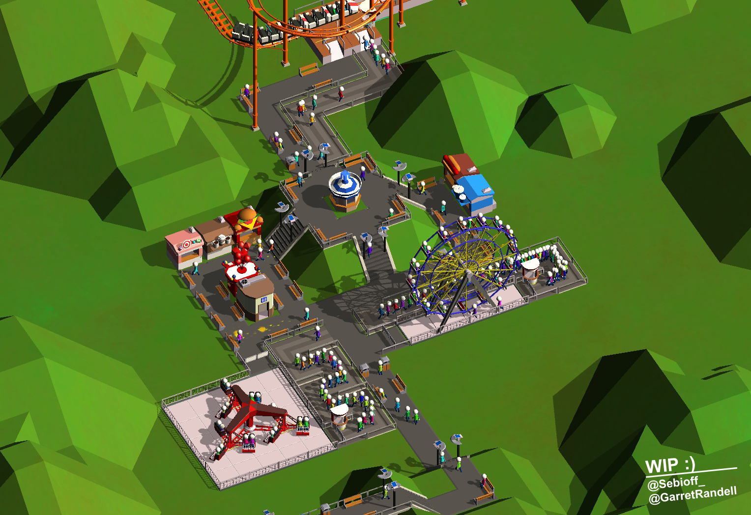 I was hesitant at first because it sounded like an impossible task, and it was clear that working on this would only make sense if the game is different enough from the theme park management games that came before it in a meaningful way. After giving it a bit more thought I saw a lot of things that could be improved over the old games and had some ideas for additions that sounded interesting to me (like the resource deliveries for the stores).